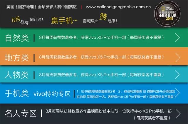 本活动奖品(vivo X5pro,价值2698元)由2015美国国家地理全球摄影大赛中国赛区战略合作伙伴vivo智能手机提供。