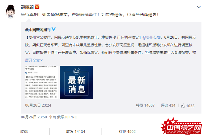 艺人赵丽颖也关注到该社会新闻,深夜转发报道称“等待真相!如果情况属实,严惩恶魔畜生!如果是谣传,也请严惩造谣者!