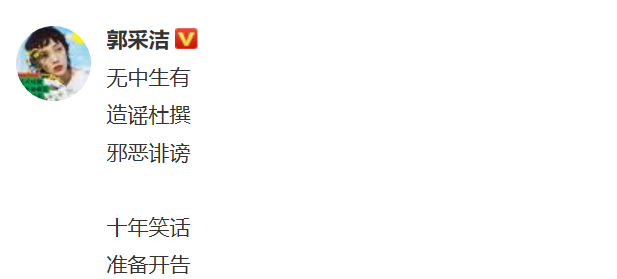 4月24日,郭采洁在微博发文辟谣维权:“无中生有 造谣杜撰 邪恶诽谤 十年笑话 准备开告。”据悉,此前有网友传郭采洁和罗志祥有不正当关系。随后郭采洁在评论区补充:“没有瓜,不用板凳,清白简单清楚,抓一个告一个,请放心。”郭采洁中文网也评论道:“有意无意的中伤,都该停止了。抱走我女孩。”