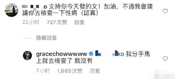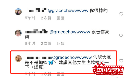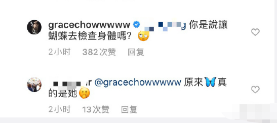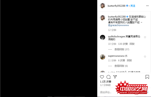 4月25日晚,蝴蝶姐姐发文向周扬青道歉,她写道:“在这里我要诚心的向周扬青小姐说声对不起,还有所有爱我的人说声对不起 ~”。此前,周扬青发完长文控诉罗志祥私生活混乱后,有网友留言称赞她,并建议她去检查下身体。不久后,周扬青回复该网友:“我分手马上就去检查了,我没有。”还有另一位网友给周扬青留言道:“告诉大家是不是蝴蝶?建议其他女生也去检查一下(认真)”周扬青回复称:“你是说让蝴蝶去检查身体吗?”还发了一个翻白眼的表情,疑似点名罗志祥曾出轨蝴蝶姐姐。