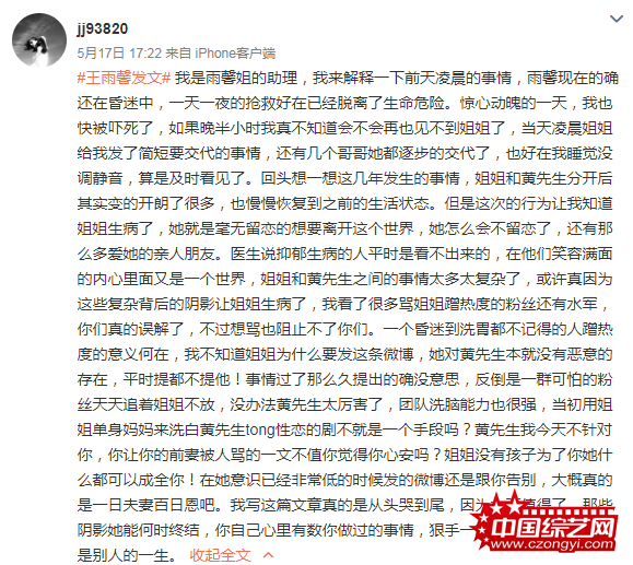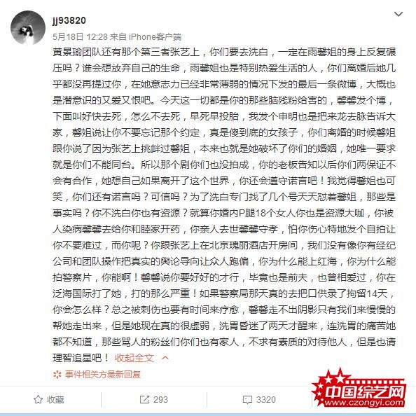王雨馨助理5月18日中午再次开口爆料,直接怒斥女演员张艺上是第三者,喊话黄景瑜团队和张艺上不要在王雨馨身上反复碾压洗白,还称黄景瑜被别人染病还是王雨馨帮忙去开药。助理表示,自从离婚后,王雨馨没有提过黄景瑜,今天这一切都是黄景瑜脑残粉丝害的,发博文被黄景瑜粉丝咒骂:快去死,怎么不去死,早死早投胎。