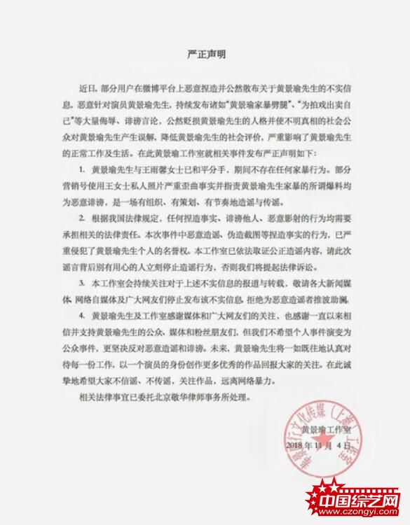 黄景瑜工作室对此发表声明承认黄景瑜与王雨馨已和平分手,期间不存在任何家暴行为,并表示针对黄景瑜“劈腿家暴”、“为拍戏出卖自己”等大量侮辱、诽谤性言论严重影响其生活。恶意造谣、伪造截图等行为,工作室将依法取证,并提起法律诉讼。