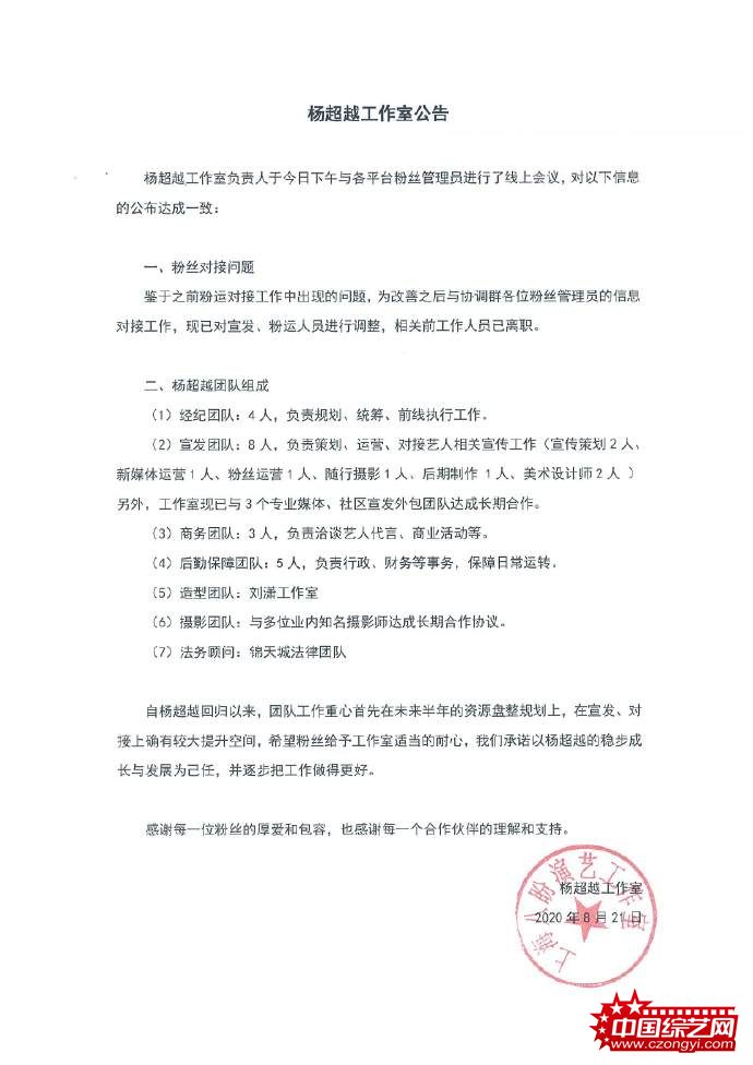 8月21日晚,杨超越工作室发公告,就粉丝对接问题和团队组成回应粉丝诉求,表示已经和各平台粉丝管理员进行了线上会议,达成一致。针对粉丝对接问题,已经对宣发、粉运工作人员进行调整,相关前工作人员已经离职,并公布了杨超越团队的构成。