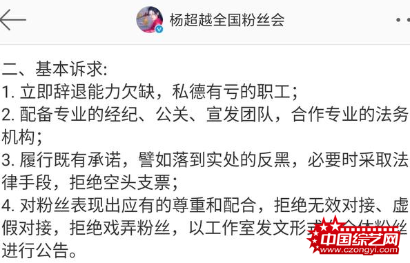近日,杨超越粉丝通过官方后援会提出诉求,希望杨超越能整顿工作室,要求包括辞退工作能力不行的职工、组建专业队伍、有力反黑等等。甚至疑似还有粉丝提出让其与现经纪公司解约的诉求。