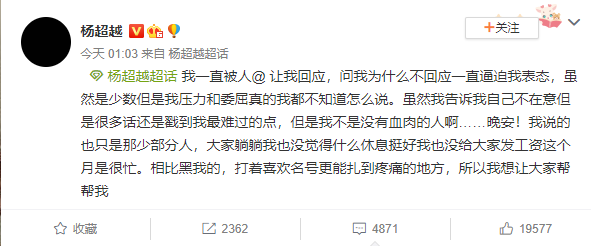 随后,21日凌晨,杨超越再度发文,称自己一直被粉丝要求回应,逼迫她表态,即便这些人只是少数,但是还是让她觉得难过。她表示,“相比黑我的,打着喜欢名号更能扎到疼痛的地方”,并请求:大家帮帮我。
