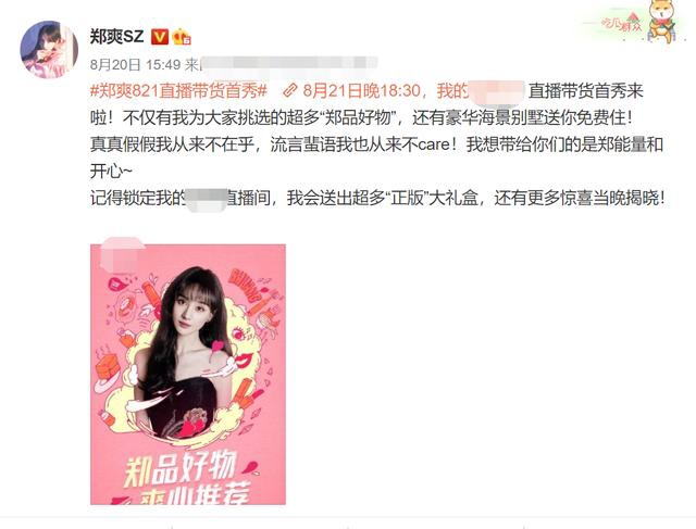 8月20日,郑爽在社交平台发布了直播预告,表示将开启自己的直播带货首秀。这场直播计划从21日下午六点半直播到次日零点,零点时正好可以庆祝郑爽的生日。