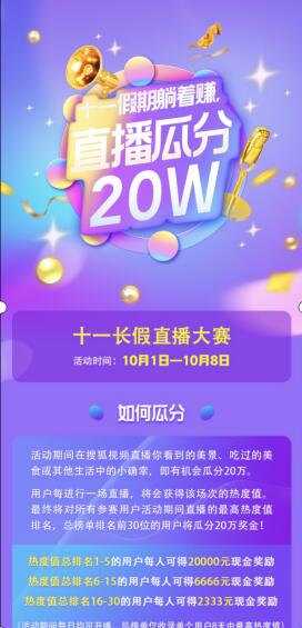 这一次的搜狐视频直播大赛,旨在让更多用户参与直播活动,也让普通用户有真实参与感。因此,搜狐视频此次发起的全民直播新玩法,参与者不需要是名人、明星、网红,只要是搜狐视频的用户,均可报名参加成为主播,通过直播,就能发挥价值和影响力。在10月1日—10月8日间,用户只要来搜狐视频APP直播,点击“点我直播瓜分20万”,通过简单流程即可参与直播,即有机会分得奖金。
