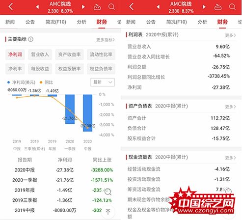 半年报数据显示,截止2020年6月30日,AMC总资产112.72亿美元。其中,现金及短期投资、短期应收账款等流动资产6.80亿美元,厂房及设备净资产、无形资产等非流动资产105.92亿美元。总负债128.47亿美元。其中,应付账款、短期债务等流动负债17.11亿美元,长期负债、递延所得税负债等非流动负债111.36亿美元。股东权益合计-15.75亿美元。经营活动现金流-4.16亿美元,投资活动现金流-1.31亿元。