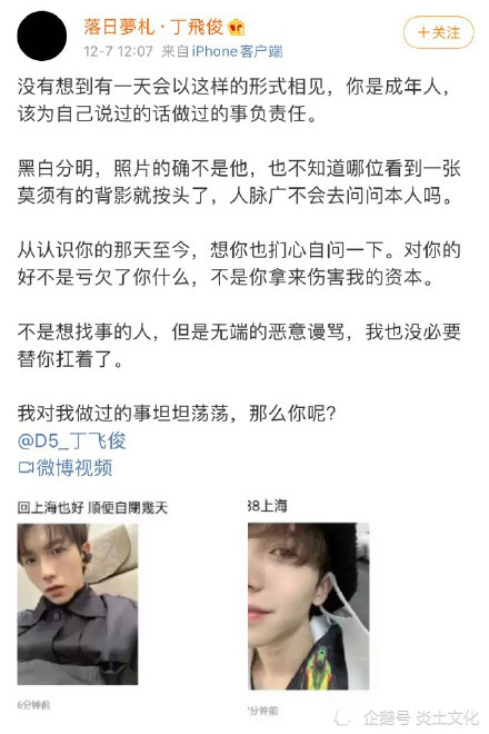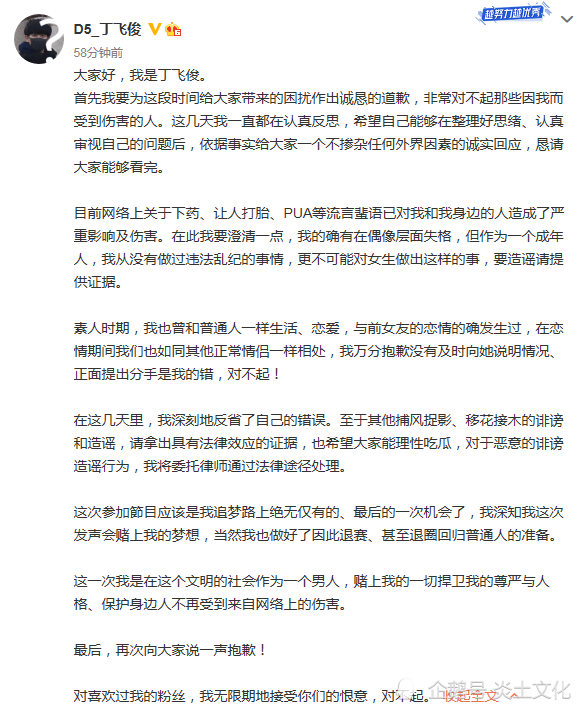 今天丁飞俊发长文道歉,表示自己的确有在偶像层面失格,但绝对从没有做过违法乱纪的事情,更不可能对女生做出这样的事。表明自己在素人时期谈过恋爱,但没有及时向她说明情况、正面提出分手。这次参加节目创4是最后的机会,虽然这次发声会赌上自己的梦想,但也做好了因此退赛、甚至退圈回归普通人的准备。