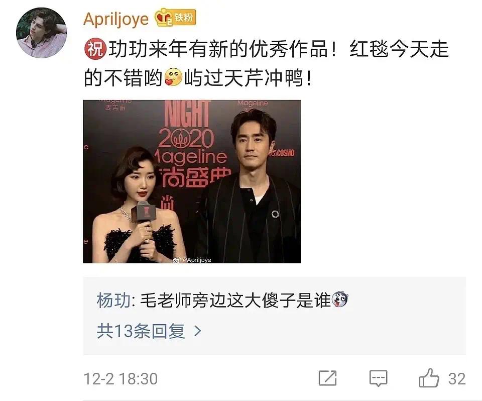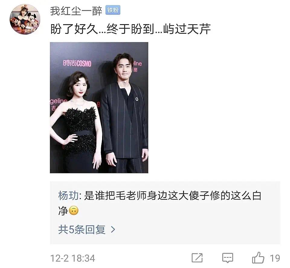 红毯结束后,杨玏还主动cue到毛晓彤,并喊她为“老师”。