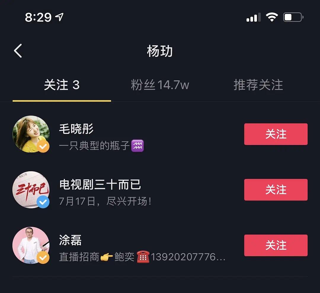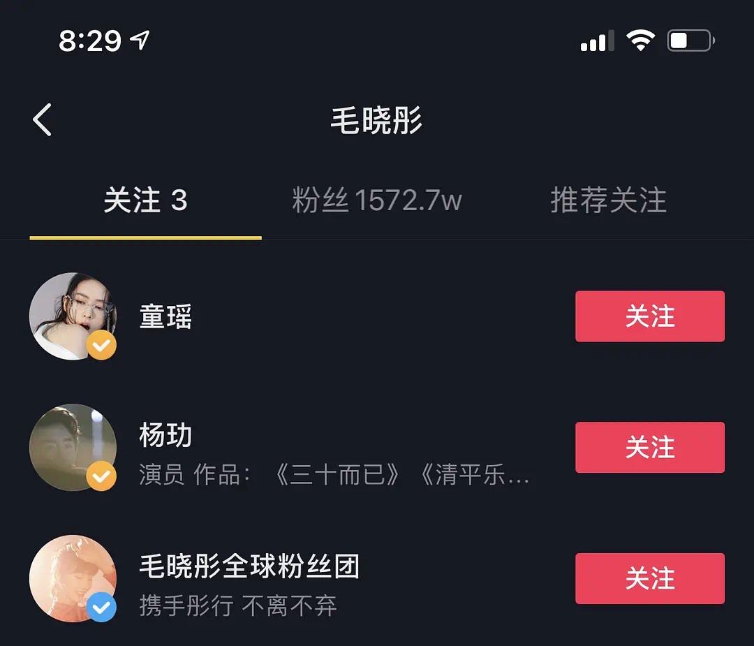 还有网友发现了一个小细节,杨玏和毛晓彤的抖音账号都只关注了三个人,而这仅有的三个人中就有一个是对方!