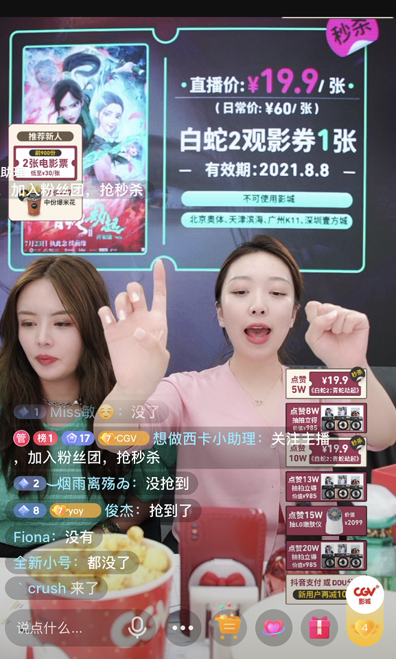 最开始直播时,用户大都由CGV影城微信、微博等自渠道引导而来。和抖音电商团队合作后,CGV每次直播抖音电商都会提供到流量和营销侧的支持。