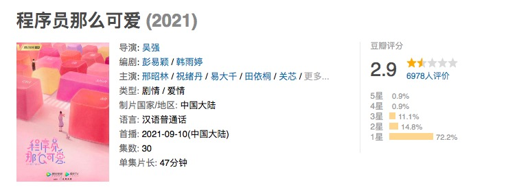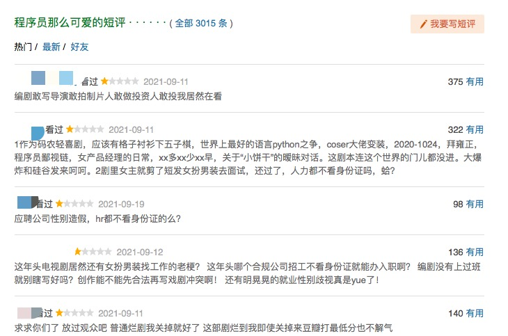 仍以《程序员》为例,在它的高赞短评中,有网友指出:“码农轻喜剧,应该有格子衬衫下无五子棋;女主剪了短发女扮男装去面试,人力都不看身份证吗?”女扮男装本极具戏剧张力,但同样需要找到适合的土壤才能生根发芽,而程序员的社畜聚焦更需要从业者用心感知和临摹。