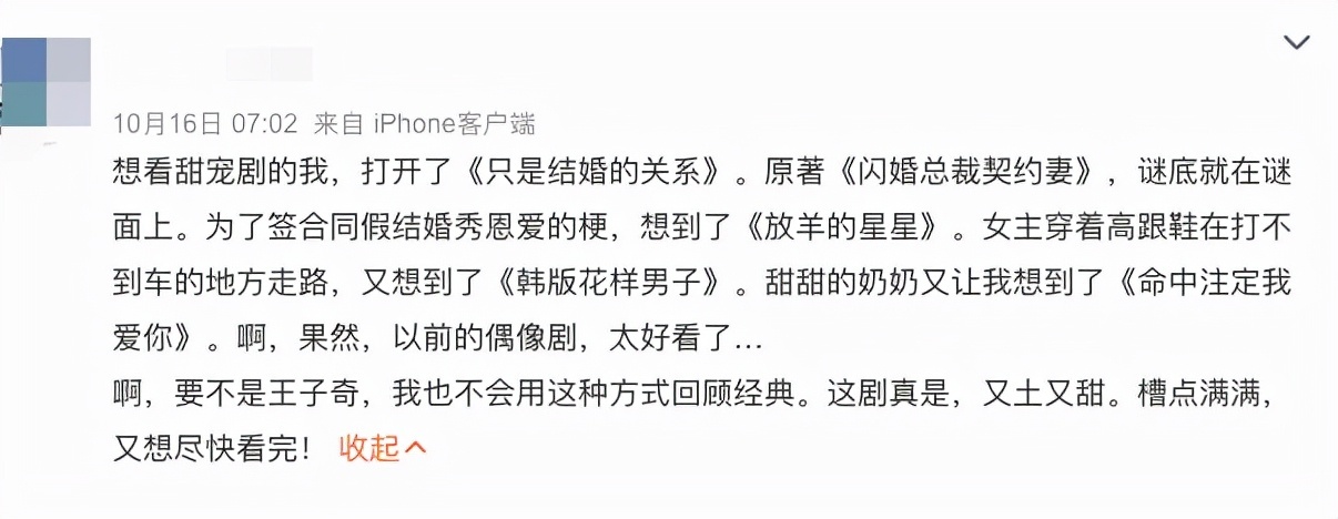 网络端,古早甜宠剧所隐隐撬动的情怀,同样是传播利器。《结婚关系》被网友调侃为“低配版《放羊的星星》”,舆论中被提及的还有《天国的嫁衣》等偶像剧,而它们也在转身成为新的传播标签。