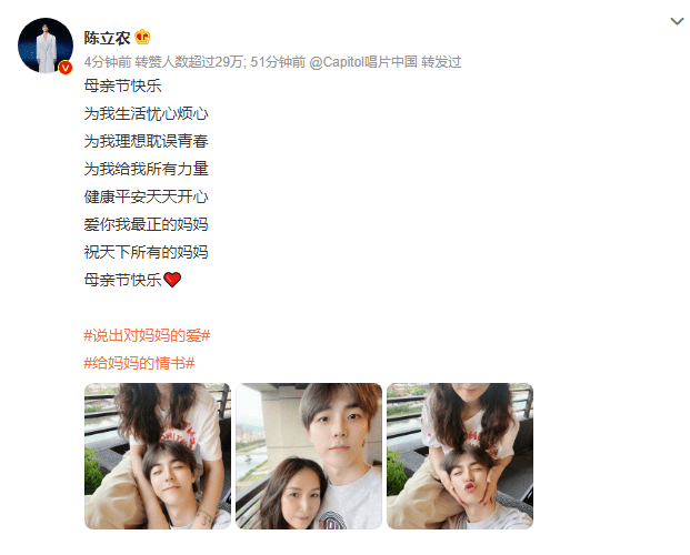 今天是母亲节,杨紫、丁程鑫、陈立农、张馨予、姚弛、容祖儿、杨丞琳、荣梓杉、张雪迎、沈梦辰、王濛等明星纷纷发博祝福母亲节快乐,晒出自己与母亲相处的点点滴滴。祝福天下所有母亲节日快乐,永远健康幸福!