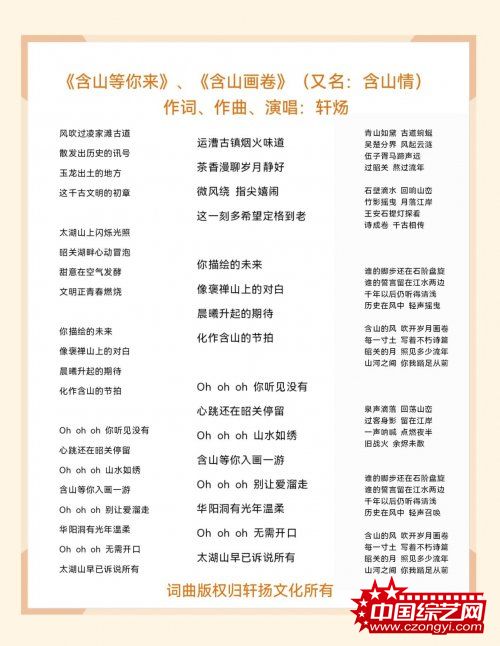 轩炀曾就学于世界流行音乐的造星工厂——伯克利音乐学院,学成归来的第一件事情就是游历祖国的大好河山,寻找创作灵感。他酷爱音乐,又对中华文化情有独钟,创作了一批富含中华文化内涵的歌曲。在前往安徽含山的采风途中,他被含山的山水灵秀与厚重人文深深打动,创作灵感随即萌生,仅用一个星期时间就一气呵成,创作了《含山等你来》、《含山情》两首经典歌曲,均由他一人作词作曲并演唱。在歌曲《含山情》中,巧妙融入当地历史经典文化元素,让千年故事在旋律中流传——“风吹过凌家滩古道,玉龙出土的地方,这千年文明的出章”;“青山如黛,古道蜿蜒,伍子胥马蹄声远”的歌词,再现了伍子胥过昭关的历史传奇。《含山等你来》则以“华阳洞有光年温柔”,呼应王安石《游褒禅山记》的哲思,将华阳洞“险、奇、美、绝”的景观特色娓娓道来 。