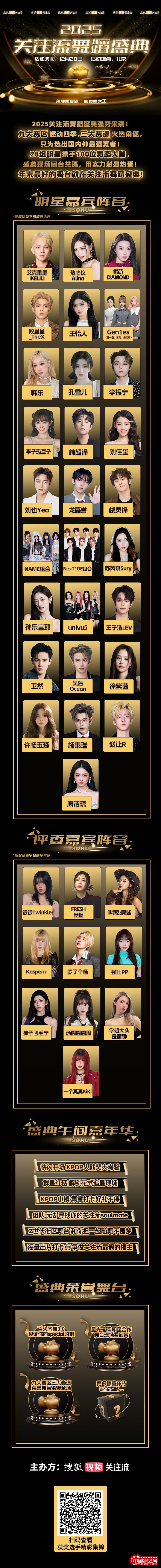 此次关注流舞蹈盛典的阵容大咖云集,星推官、盛典嘉宾、明星播主齐聚一堂,包括:艾克里里、敖心仪、戴萌DIAMOND、段星星、Gen1es乔一鱼、Genles 王珂、Genles 朱奕萌、韩东、孔雪儿、龙嘉誉、楼炅择、刘也、李振宁、李子璇豆子、NAME组合、NexT1DE、苏芮琪Sury、univu5、吴海、王怡人、王子浩、许杨玉琢、徐紫茵、杨泰瑞、周洁琼、赵让R;主持人:林超泽、孙乐言、卫然(按姓名拼音排序,排名不分先后)。