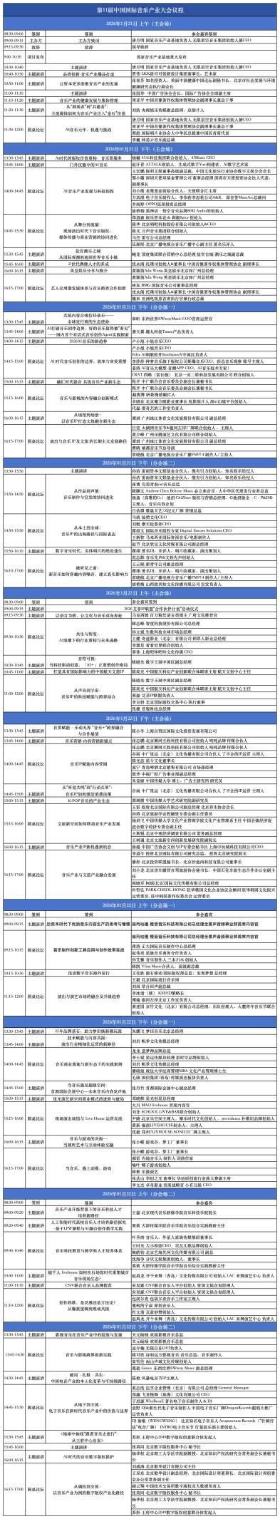 本届大会紧扣行业脉搏,精心设置超20组核心议题,每个议题延伸4-5个细分方向,层层深入解析产业痛点与机遇。议题涵盖AI音乐创作与版权重构、现场演出与文旅融合、数字音乐海外发行、艺人全周期发展、音乐科技人才培养等关键领域,既聚焦 “AI音乐元年的机遇与挑战”“生成式AI对创作生态的影响” 等前沿趋势,也关注内容合规、实体唱片转型、中小音乐人扶持等行业现实议题。